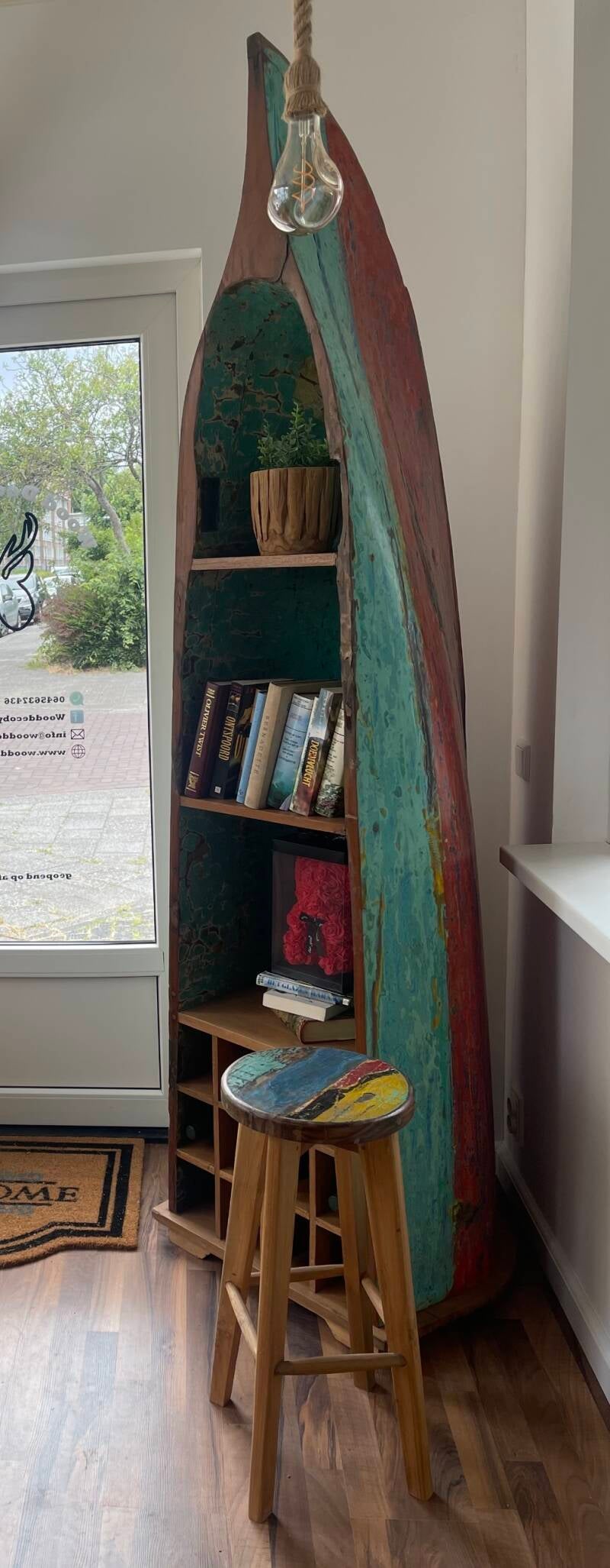 BOOTKAST MET WIJNREK, VOORMALIG VISSERSBOOTJE & KRUKJE GEMAAKT VAN VOORMALIG VISSERSBOOTJE